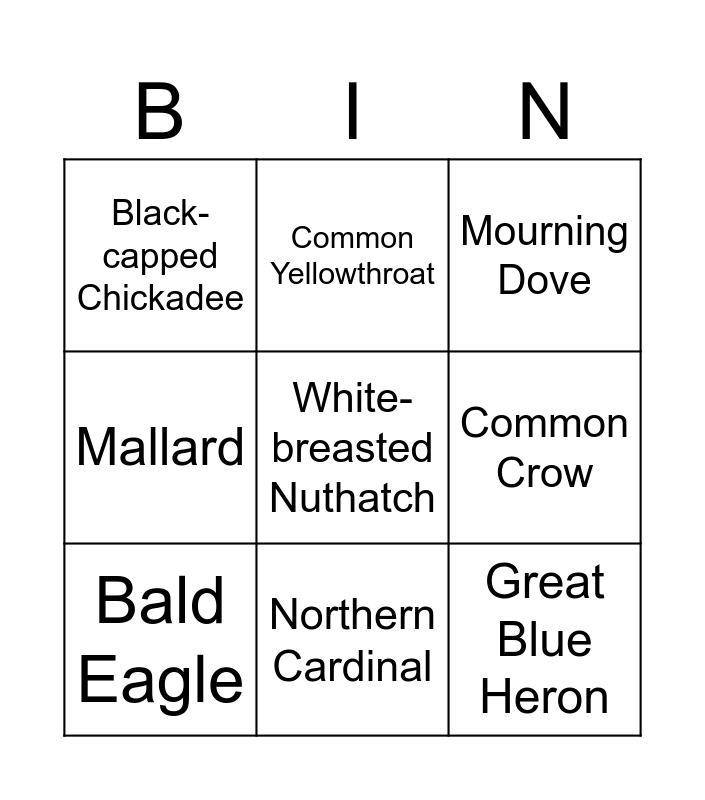 This bingo card has 15 words: Free!, Pileated Woodpecker, Mourning Dove, Black-capped Chickadee, Northern Cardinal, White-breasted Nuthatch, American Robin, Barred Owl, Common Crow, Great Blue Heron, Red-winged Blackbird, Mallard, Bald Eagle, Common Yellowthroat and Red-headed Woodpecker.