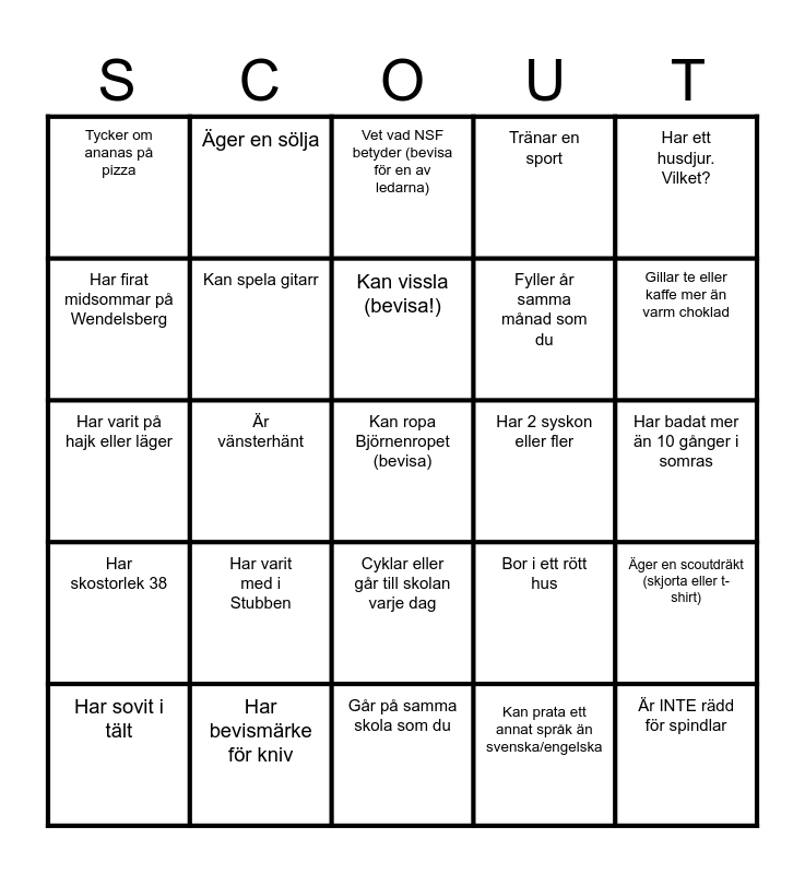 This bingo card has a free space and 24 words: Har varit med i Stubben, Har bevismärke för kniv, Kan vissla (bevisa!), Har sovit i tält, Har ett husdjur. Vilket?, Tycker om ananas på pizza, Har firat midsommar på Wendelsberg, Äger en sölja, Har 2 syskon eller fler, Cyklar eller går till skolan varje dag, Fyller år samma månad som du, Har varit på hajk eller läger, Bor i ett rött hus, Äger en scoutdräkt (skjorta eller t-shirt), Kan spela gitarr, Kan prata ett annat språk än svenska/engelska, Har badat mer än 10 gånger i somras, Vet vad NSF betyder (bevisa för en av ledarna), Gillar te eller kaffe mer än varm choklad, Är vänsterhänt, Är INTE rädd för spindlar, Har skostorlek 38, Tränar en sport and Går på samma skola som du.
