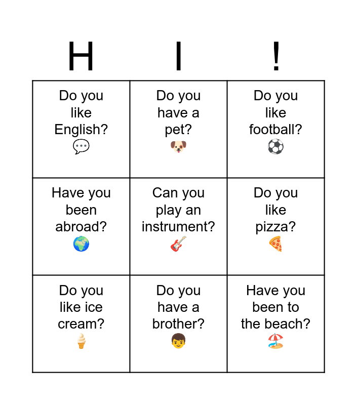This bingo card has a free space and 8 words: Do you like pizza? 🍕, Do you like football? ⚽, Do you have a pet? 🐶, Do you like ice cream? 🍦, Do you like English? 💬, Have you been to the beach? 🏖, Have you been abroad? 🌍 and Do you have a brother? 👦.