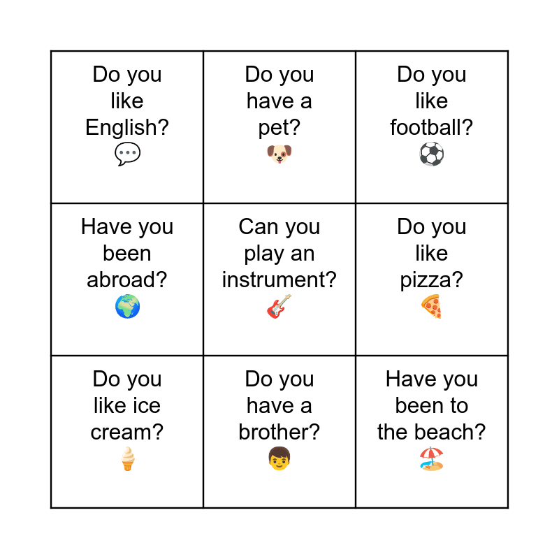 This bingo card has a free space and 8 words: Do you like pizza? 🍕, Do you like football? ⚽, Do you have a pet? 🐶, Do you like ice cream? 🍦, Do you like English? 💬, Have you been to the beach? 🏖, Have you been abroad? 🌍 and Do you have a brother? 👦.