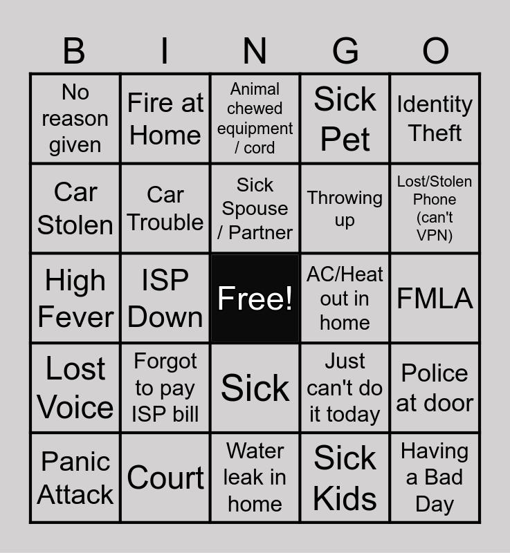 This bingo card has a free space and 26 words: Sick, Sick Kids, Sick Spouse / Partner, Court, Identity Theft, No reason given, Car Stolen, Fire at Home, FMLA, Just can't do it today, Throwing up, High Fever, Police at door, Panic Attack, ISP Down, Power Outage, Sick Pet, Lost Voice, Animal chewed equipment / cord, Having a Bad Day, Lost/Stolen Phone (can't VPN), Water leak in home, AC/Heat out in home, Forgot to pay ISP bill, Car Trouble and Flat Tire.