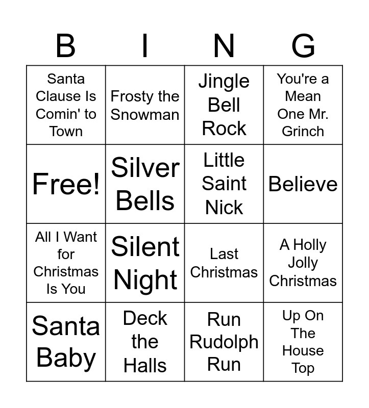 This bingo card has 16 words: Deck the Halls, A Holly Jolly Christmas, Jingle Bell Rock, Santa Clause Is Comin' to Town, All I Want for Christmas Is You, Frosty the Snowman, Last Christmas, Run Rudolph Run, Free!, Silver Bells, Santa Baby, You're a Mean One Mr. Grinch, Silent Night, Believe, Little Saint Nick and Up On The House Top.
