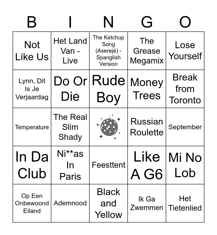 This bingo card has a free space and 48 words: Even Aan Mijn Moeder Vragen, Het Tietenlied, Jungle, Black and Yellow, Ni**as In Paris, Een bom, Het Land Van - Live, Gasolina, Lynn, Dit Is Je Verjaardag, Miss Independent, Do Or Die, The Grease Megamix, Mi No Lob, Like A G6, Replay, Young, Wild & Free, Rude Boy, Russian Roulette, Stupid In Love, Lose Yourself, The Real Slim Shady, Ik Ga Zwemmen, Not Like Us, Money Trees, Passionfruit, Break from Toronto, Op Een Onbewoond Eiland, Africa, Feesttent, In Da Club, Happy Birthday, One Dance, Too Good, Casanova, Ademnood, Aruba National Anthem, The Spins, September, Homecoming, Can't Hold Us, PRETTY GIRLS, ZAAZAA, The Ketchup Song (Aserejé) - Spanglish Version, Omlaag, Temperature, Crank That, It Wasn't Me and Low.