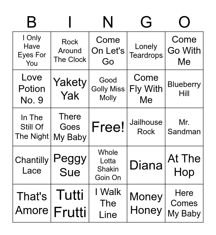 This bingo card has a free space and 24 words: Peggy Sue, Tutti Frutti, Good Golly Miss Molly, That's Amore, Come Go With Me, I Only Have Eyes For You, Love Potion No. 9, Rock Around The Clock, Jailhouse Rock, Whole Lotta Shakin Goin On, Come Fly With Me, In The Still Of The Night, Diana, At The Hop, Yakety Yak, Money Honey, Mr. Sandman, Come On Let's Go, Blueberry Hill, There Goes My Baby, Here Comes My Baby, Chantilly Lace, Lonely Teardrops and I Walk The Line.
