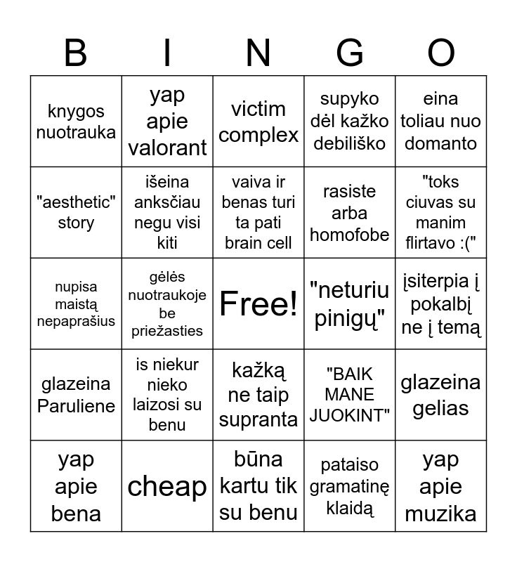 This bingo card has a free space and 24 words: is niekur nieko laizosi su benu, cheap, vaiva ir benas turi ta pati brain cell, yap apie bena, eina toliau nuo domanto, knygos nuotrauka, "aesthetic" story, yap apie valorant, "neturiu pinigų", kažką ne taip supranta, rasiste arba homofobe, nupisa maistą nepaprašius, "BAIK MANE JUOKINT", glazeina gelias, išeina anksčiau negu visi kiti, pataiso gramatinę klaidą, įsiterpia į pokalbį ne į temą, victim complex, "toks ciuvas su manim flirtavo :(", gėlės nuotraukoje be priežasties, yap apie muzika, glazeina Paruliene, supyko dėl kažko debiliško and būna kartu tik su benu.