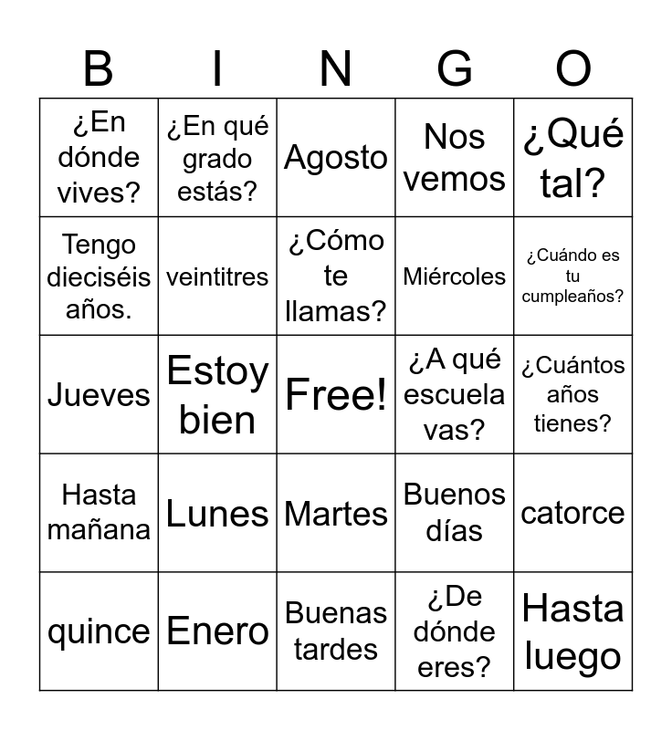 This bingo card has a free space and 24 words: Lunes, Enero, ¿Cómo te llamas?, quince, ¿Qué tal?, ¿En dónde vives?, Tengo dieciséis años., ¿En qué grado estás?, ¿A qué escuela vas?, Martes, Miércoles, Jueves, Buenos días, catorce, veintitres, ¿De dónde eres?, ¿Cuántos años tienes?, Agosto, ¿Cuándo es tu cumpleaños?, Estoy bien, Hasta luego, Hasta mañana, Nos vemos and Buenas tardes.