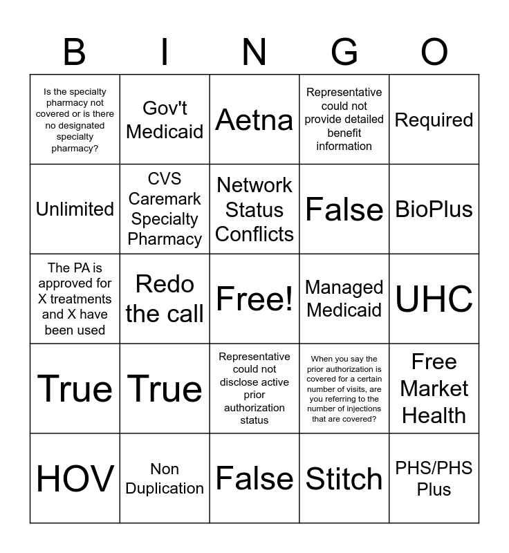 This bingo card has a free space and 24 words: True, Non Duplication, Network Status Conflicts, HOV, Required, Is the specialty pharmacy not covered or is there no designated specialty pharmacy?, Unlimited, Gov't Medicaid, Managed Medicaid, Representative could not disclose active prior authorization status, False, The PA is approved for X treatments and X have been used, When you say the prior authorization is covered for a certain number of visits, are you referring to the number of injections that are covered?, Free Market Health, CVS Caremark Specialty Pharmacy, Stitch, UHC, Aetna, BioPlus, Redo the call, PHS/PHS Plus, True, Representative could not provide detailed benefit information and False.