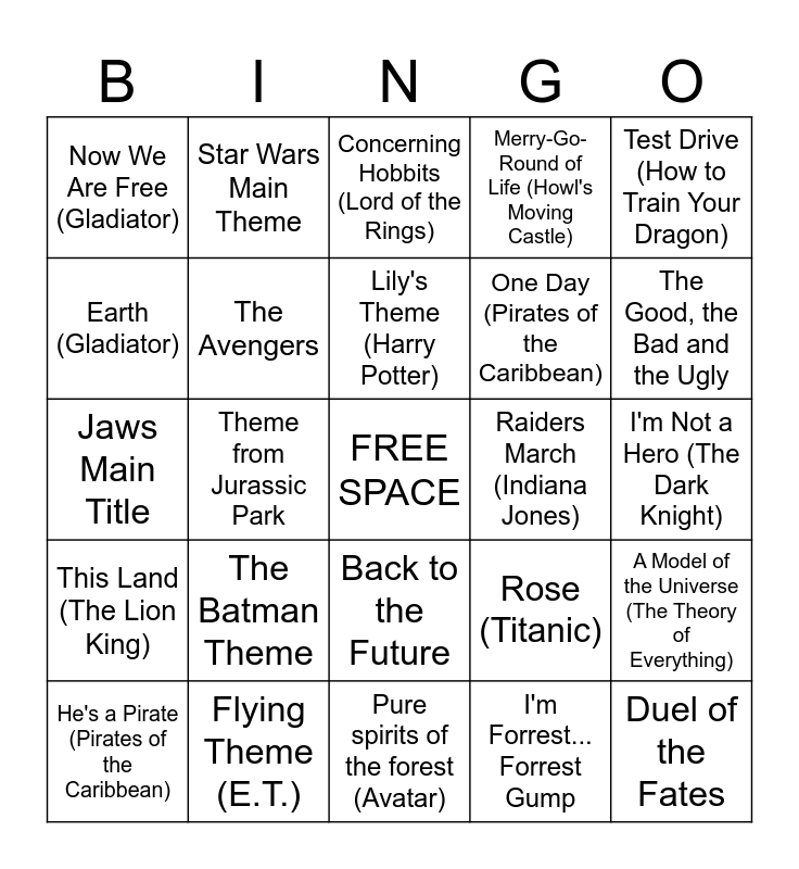 This bingo card has a free space and 29 words: He's a Pirate (Pirates of the Caribbean), Time (Inception), Theme from Jurassic Park, Cornfield Chase (Interstellar), Now We Are Free (Gladiator), Concerning Hobbits (Lord of the Rings), The Avengers, The Batman Theme, Raiders March (Indiana Jones), Flying Theme (E.T.), I'm Not a Hero (The Dark Knight), Duel of the Fates, Pure spirits of the forest (Avatar), I'm Forrest... Forrest Gump, The Good, the Bad and the Ugly, Hedwig's Theme (Harry Potter), Back to the Future, This Land (The Lion King), Test Drive (How to Train Your Dragon), Jaws Main Title, Rose (Titanic), The Godfather Waltz, One Day (Pirates of the Caribbean), Earth (Gladiator), Merry-Go-Round of Life (Howl's Moving Castle), Star Wars Main Theme, A Model of the Universe (The Theory of Everything), Lily's Theme (Harry Potter) and The Breaking of the Fellowship (LOTR).