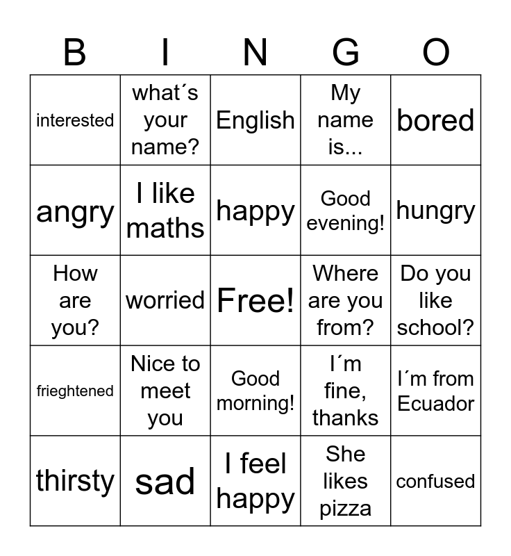 This bingo card has a free space and 24 words: Nice to meet you, sad, happy, thirsty, bored, interested, angry, what´s your name?, Where are you from?, Good morning!, Good evening!, How are you?, I´m fine, thanks, I´m from Ecuador, I like maths, She likes pizza, Do you like school?, English, hungry, worried, confused, frieghtened, My name is... and I feel happy.