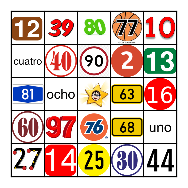 This bingo card has 29 images, a free space and 5 words: cuatro, seis, ocho, uno and cinco.