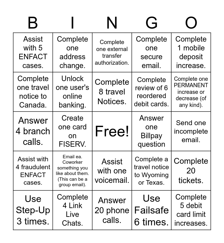 This bingo card has a free space and 24 words: Email ea. Coworker something you like about them. (This can be a group email)., Complete 4 Link Live Chats., Complete 8 travel Notices., Use Step-Up 3 times., Complete 1 mobile deposit increase., Assist with 5 ENFACT cases., Complete one travel notice to Canada., Complete one address change., Answer one Billpay question, Assist with one voicemail., Complete review of 6 reordered debit cards., Answer 4 branch calls., Complete a travel notice to Wyoming or Texas., Complete 20 tickets., Unlock one user's online banking., Use Failsafe 6 times., Send one incomplete email., Complete one external transfer authorization., Complete one PERMANENT increase or decrease (of any kind)., Create one card on FISERV., Complete 5 debit card limit increases., Assist with 4 fraudulent ENFACT cases., Complete one secure email. and Answer 20 phone calls..
