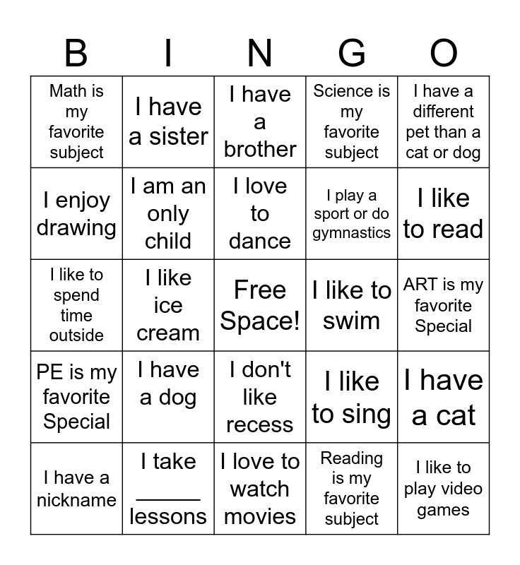 This bingo card has a free space and 24 words: I have a dog, I take _____ lessons, I love to dance, I have a nickname, I have a different pet than a cat or dog, Math is my favorite subject, I enjoy drawing, I have a sister, I like to swim, I don't like recess, I play a sport or do gymnastics, I like to spend time outside, I like to sing, I have a cat, I am an only child, Reading is my favorite subject, ART is my favorite Special, I have a brother, I like to read, I like ice cream, I like to play video games, PE is my favorite Special, Science is my favorite subject and I love to watch movies.
