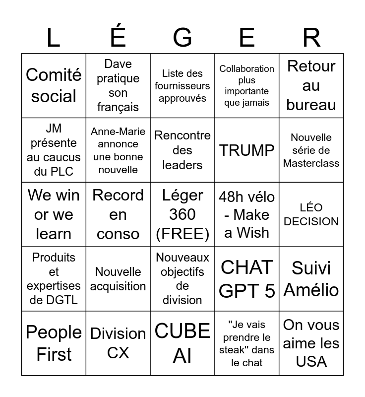 This bingo card has a free space and 24 words: Nouvelle acquisition, Division CX, Rencontre des leaders, People First, Retour au bureau, Comité social, JM présente au caucus du PLC, Dave pratique son français, 48h vélo - Make a Wish, Nouveaux objectifs de division, TRUMP, We win or we learn, CHAT GPT 5, Suivi Amélio, Anne-Marie annonce une bonne nouvelle, ''Je vais prendre le steak'' dans le chat, LÉO DECISION, Liste des fournisseurs approuvés, Nouvelle série de Masterclass, Record en conso, On vous aime les USA, Produits et expertises de DGTL, Collaboration plus importante que jamais and CUBE AI.