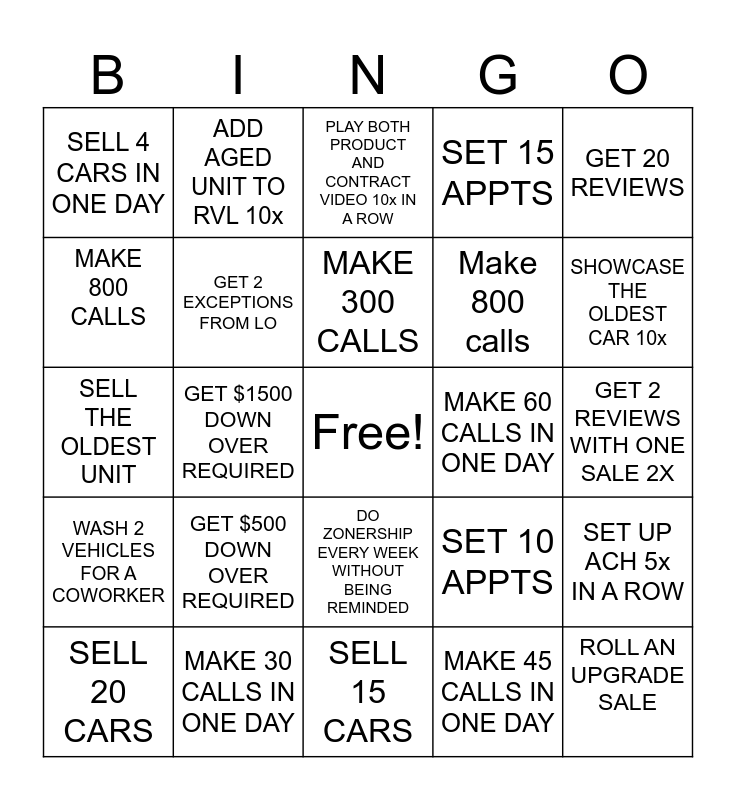 This bingo card has a free space and 24 words: GET $500 DOWN OVER REQUIRED, MAKE 30 CALLS IN ONE DAY, MAKE 300 CALLS, SELL 20 CARS, GET 20 REVIEWS, SELL 4 CARS IN ONE DAY, MAKE 800 CALLS, ADD AGED UNIT TO RVL 10x, MAKE 60 CALLS IN ONE DAY, DO ZONERSHIP EVERY WEEK WITHOUT BEING REMINDED, Make 800 calls, SELL THE OLDEST UNIT, SET 10 APPTS, SET UP ACH 5x IN A ROW, GET 2 EXCEPTIONS FROM LO, MAKE 45 CALLS IN ONE DAY, GET 2 REVIEWS WITH ONE SALE 2X, PLAY BOTH PRODUCT AND CONTRACT VIDEO 10x IN A ROW, SHOWCASE THE OLDEST CAR 10x, GET $1500 DOWN OVER REQUIRED, ROLL AN UPGRADE SALE, WASH 2 VEHICLES FOR A COWORKER, SET 15 APPTS and SELL 15 CARS.