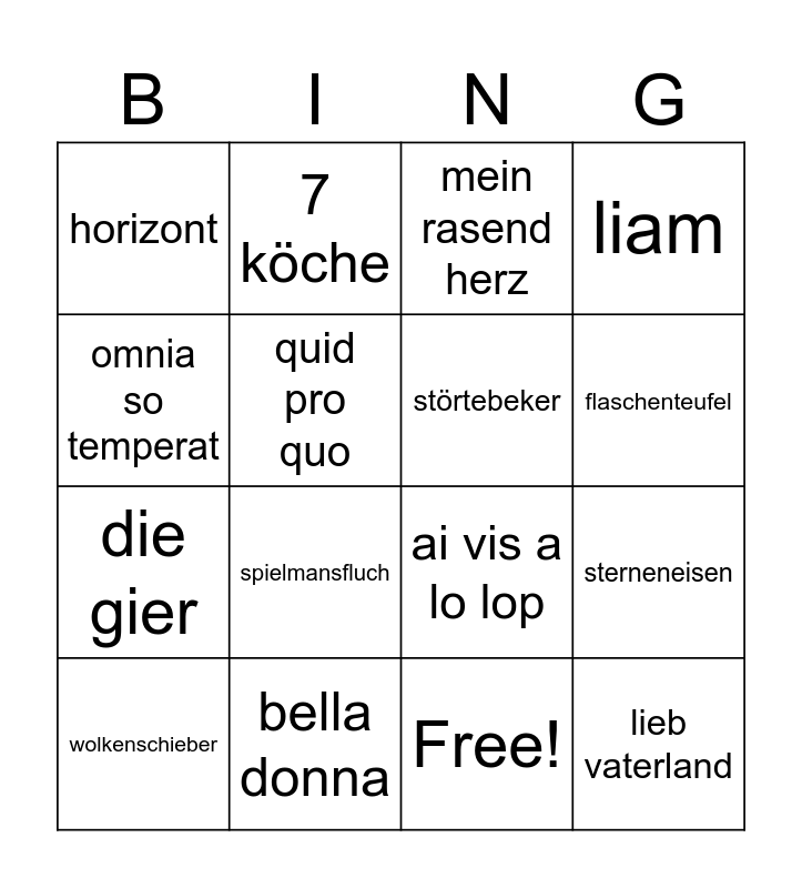 This bingo card has 17 words: Free!, wolkenschieber, mein rasend herz, horizont, spielmansfluch, liam, sterneneisen, störtebeker, flaschenteufel, quid pro quo, bella donna, ai vis a lo lop, omnia so temperat, 7 köche, die gier, zigeunerskat and lieb vaterland.