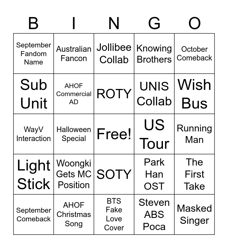This bingo card has a free space and 24 words: Woongki Gets MC Position, AHOF Christmas Song, ROTY, September Comeback, October Comeback, September Fandom Name, Sub Unit, Australian Fancon, US Tour, SOTY, UNIS Collab, WayV Interaction, Park Han OST, The First Take, AHOF Commercial AD, Steven ABS Poca, Running Man, Jollibee Collab, Wish Bus, Halloween Special, Masked Singer, Light Stick, Knowing Brothers and BTS Fake Love Cover.