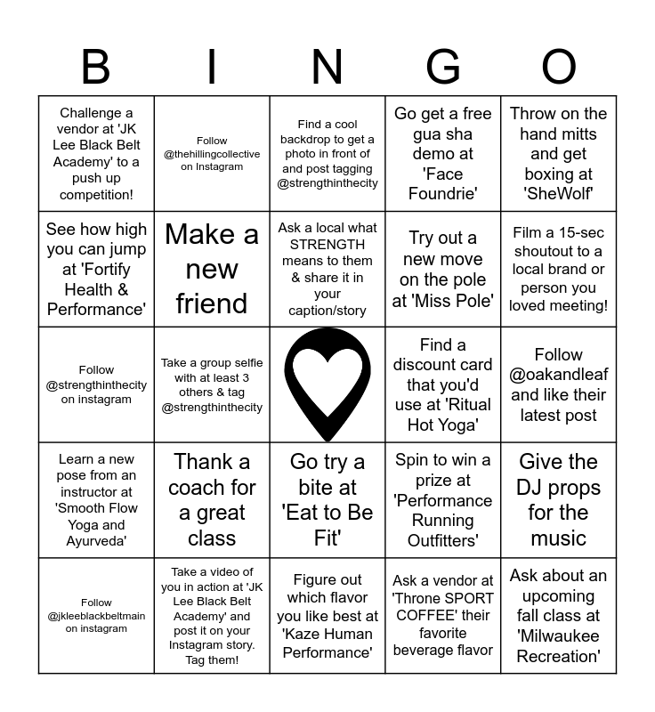 This bingo card has a free space and 54 words: Ask an instructor their favorite yoga pose at '8th State Hot Yoga', Learn a new pose from an instructor at 'Smooth Flow Yoga and Ayurveda', Try an ashiatsu massage demo at 'Anointed Hands Massage and Pliates Studio', Take a class with 'Barre3' Milwaukee, Go try a bite at 'Eat to Be Fit', Comment on @tribalyogaschool 's last post on Instagram, Go get a free gua sha demo at 'Face Foundrie', Get your blood pumping in a 'Flex Zone' class, See how high you can jump at 'Fortify Health & Performance', Follow @goodeatssandwiches on instagram and like their last post, Challenge a vendor at 'JK Lee Black Belt Academy' to a push up competition!, Learn 3 basic moves at 'JK Lee Black Belt Academy', Take a video of you in action at 'JK Lee Black Belt Academy' and post it on your Instagram story. Tag them!, Follow @jkleeblackbeltmain on instagram, Spin the wheel at 'JK Lee Black Belt Academy', Figure out which flavor you like best at 'Kaze Human Performance', Ask about an upcoming fall class at 'Milwaukee Recreation', Try out a new move on the pole at 'Miss Pole', Pour an LMNT sample into your water for extra hydration at 'Mood Swing Wellness', Follow @oakandleaf and like their latest post, Spin to win a prize at 'Performance Running Outfitters', Go high five a 'POUND' team member, Find a discount card that you'd use at 'Ritual Hot Yoga', Throw on the hand mitts and get boxing at 'SheWolf', Follow @the.chaicompany on instagram, Follow @thehillingcollective on Instagram, Sample a beverage at 'Throne SPORT COFFE', Challenge a 'Toned Body Fitness' instructor to a push-up contest, Post a story on Instagram at 'Throne SPORT COFFEE' and tag them @sportcoffee, Ask a vendor at 'Throne SPORT COFFEE' their favorite beverage flavor, Taste a new flavor at 'Throne SPORTS COFFEE', Comment on @sportcoffee 's last post on Instagram, High Five a team member at 'Throne SPORT COFFEE', Ask a new person what their favorite ice cream flavor is, Find a cool backdrop to get a photo in front of and post tagging @strengthinthecity, Find our content team and tell them 'What the best part of the event has been', Follow @strengthinthecity on instagram, Give the DJ props for the music, High five a stranger, Make a new friend, Take a class on the Strength Stage, Take 3 classes in a row, Take a class on the Be Present stage, Take a Yoga class, Thank a coach for a great class, Try a class you've never done before, Give a STRENGTH IN THE CITY team member a high five, Show me your strength!" – Flex with a new friend & tag @strengthinthecity, Ask a local what STRENGTH means to them & share it in your caption/story, Take a group selfie with at least 3 others & tag @strengthinthecity, Film a 15-sec shoutout to a local brand or person you loved meeting!, Post a photo with more than 5 people, Take a sweaty selfie and tag @sweatpalsapp and Take class with a 'Barre3' instructor.