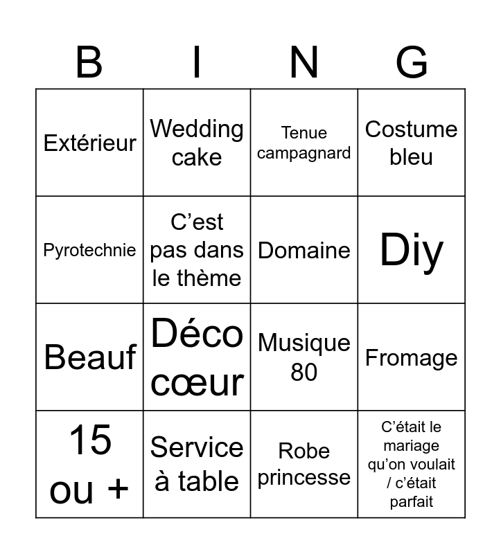 This bingo card has 16 words: Service à table, Fromage, Tenue campagnard, Extérieur, Beauf, Wedding cake, Musique 80, Robe princesse, Pyrotechnie, C’est pas dans le thème, 15 ou +, Costume bleu, Déco cœur, Diy, Domaine and C’était le mariage qu’on voulait / c’était parfait.