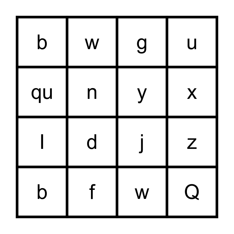 This bingo card has 78 words: c, o, g, a, d, s, l, i, t, f, e, h, u, b, r, n, m, p, v, w, k, qu, j, x, y, z, c, o, g, a, d, s, l, i, t, f, e, h, u, b, r, n, m, p, v, w, k, qu, j, x, y, z, A, B, C, D, E, F, G, H, I, J, K, L, M, N, O, P, Q, R, S, T, U, V, W, X, Y and Z.