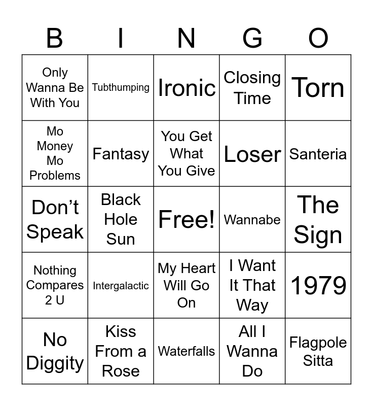 This bingo card has a free space and 44 words: Vogue, Flagpole Sitta, Jeremy, No Diggity, Losing My Religion, All I Wanna Do, Ironic, If It Makes You Happy, Torn, Kiss From a Rose, Closing Time, Wannabe, My Heart Will Go On, Intergalactic, Barbie Girl, Waterfalls, Iris, Don’t Speak, Killing Me Softly, Santeria, Tubthumping, Mr.Jones, Just a Girl, Only Wanna Be With You, No Scrubs, The Sign, Lovefool, Wonderwall, I Want It That Way, Nothing Compares 2 U, End of the Road, 1979, Semi-charmed Life, Bittersweet Symphony, Black Hole Sun, Zombie, Believe, You Can’t Touch This, You Get What You Give, Mo Money Mo Problems, Loser, Smells Like Teen Spirit, Fantasy and Baby Got Back.