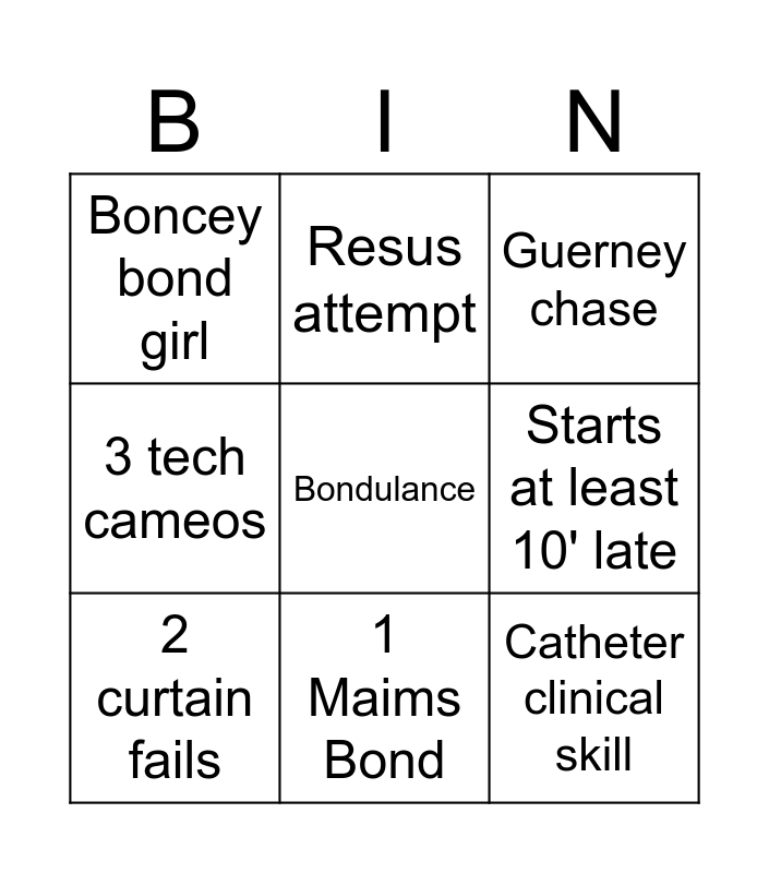 This bingo card has 9 words: 2 curtain fails, Guerney chase, Resus attempt, 3 tech cameos, Boncey bond girl, Starts at least 10' late, Bondulance, Catheter clinical skill and 1 Maims Bond.