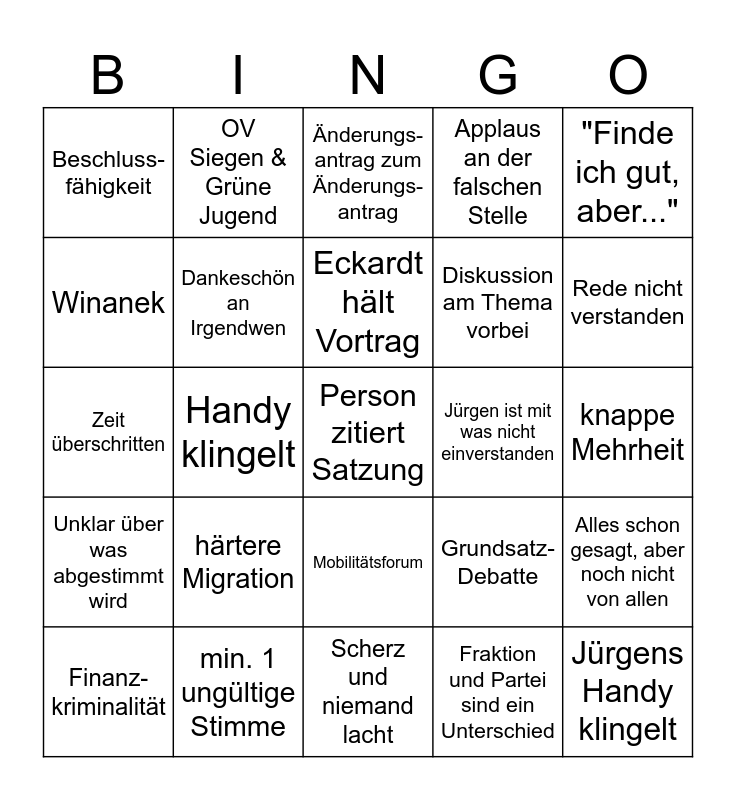 This bingo card has a free space and 24 words: härtere Migration, min. 1 ungültige Stimme, Eckardt hält Vortrag, Finanz-kriminalität, "Finde ich gut, aber...", Beschluss-fähigkeit, Winanek, OV Siegen & Grüne Jugend, Jürgen ist mit was nicht einverstanden, Mobilitätsforum, Diskussion am Thema vorbei, Zeit überschritten, Grundsatz-Debatte, Alles schon gesagt, aber noch nicht von allen, Dankeschön an Irgendwen, Fraktion und Partei sind ein Unterschied, knappe Mehrheit, Änderungs-antrag zum Änderungs-antrag, Rede nicht verstanden, Handy klingelt, Jürgens Handy klingelt, Unklar über was abgestimmt wird, Applaus an der falschen Stelle and Scherz und niemand lacht.
