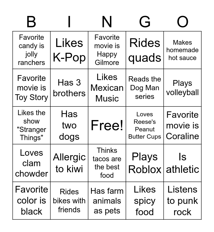 This bingo card has a free space and 24 words: Allergic to kiwi, Rides bikes with friends, Likes Mexican Music, Favorite color is black, Makes homemade hot sauce, Favorite candy is jolly ranchers, Favorite movie is Toy Story, Likes K-Pop, Loves Reese's Peanut Butter Cups, Thinks tacos are the best food, Reads the Dog Man series, Likes the show "Stranger Things", Plays Roblox, Is athletic, Has 3 brothers, Likes spicy food, Favorite movie is Coraline, Favorite movie is Happy Gilmore, Plays volleyball, Has two dogs, Listens to punk rock, Loves clam chowder, Rides quads and Has farm animals as pets.