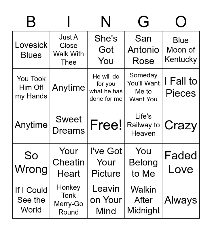 This bingo card has a free space and 24 words: Your Cheatin Heart, Honkey Tonk Merry-Go Round, He will do for you what he has done for me, If I Could See the World, Blue Moon of Kentucky, Lovesick Blues, You Took Him Off my Hands, Just A Close Walk With Thee, Life's Railway to Heaven, I've Got Your Picture, Someday You'll Want Me to Want You, Anytime, You Belong to Me, Faded Love, Anytime, Walkin After Midnight, Crazy, She's Got You, I Fall to Pieces, Sweet Dreams, Always, So Wrong, San Antonio Rose and Leavin on Your Mind.