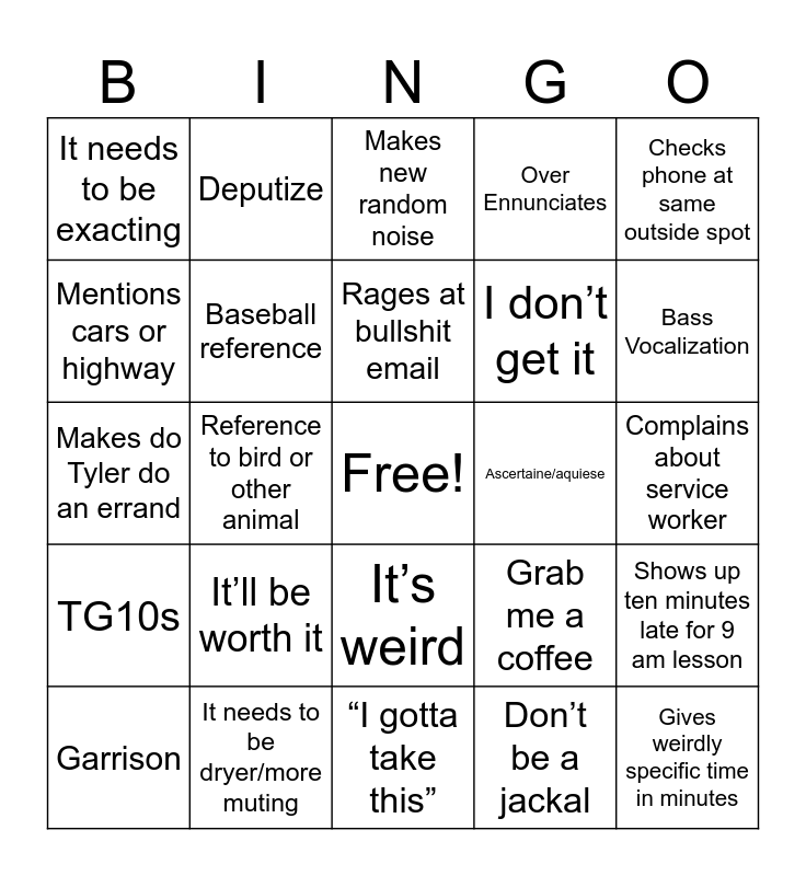 This bingo card has a free space and 24 words: It’ll be worth it, It needs to be dryer/more muting, Rages at bullshit email, Garrison, Checks phone at same outside spot, It needs to be exacting, Mentions cars or highway, Deputize, Ascertaine/aquiese, It’s weird, I don’t get it, Makes do Tyler do an errand, Grab me a coffee, Shows up ten minutes late for 9 am lesson, Baseball reference, Don’t be a jackal, Complains about service worker, Makes new random noise, Bass Vocalization, Reference to bird or other animal, Gives weirdly specific time in minutes, TG10s, Over Ennunciates and “I gotta take this”.