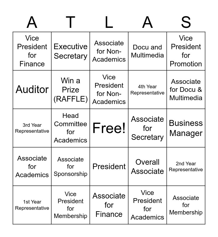 This bingo card has a free space and 26 words: President, Vice President for Academics, Vice President for Non-Academics, Vice President for Membership, Vice President for Promotion, Vice President for Finance, Auditor, Executive Secretary, Business Manager, Overall Associate, 4th Year Representative, 3rd Year Representative, 2nd Year Representative, 1st Year Representative, Head Committee for Academics, Head Committee for Non-Academics, Docu and Multimedia, Associate for Academics, Associate for Non-Academics, Associate for Membership, Associate for Docu & Multimedia, Associate for Finance, Associate for Secretary, Associate for Sponsorship, Win a Prize (RAFFLE) and Win a Prize (BOOTH).