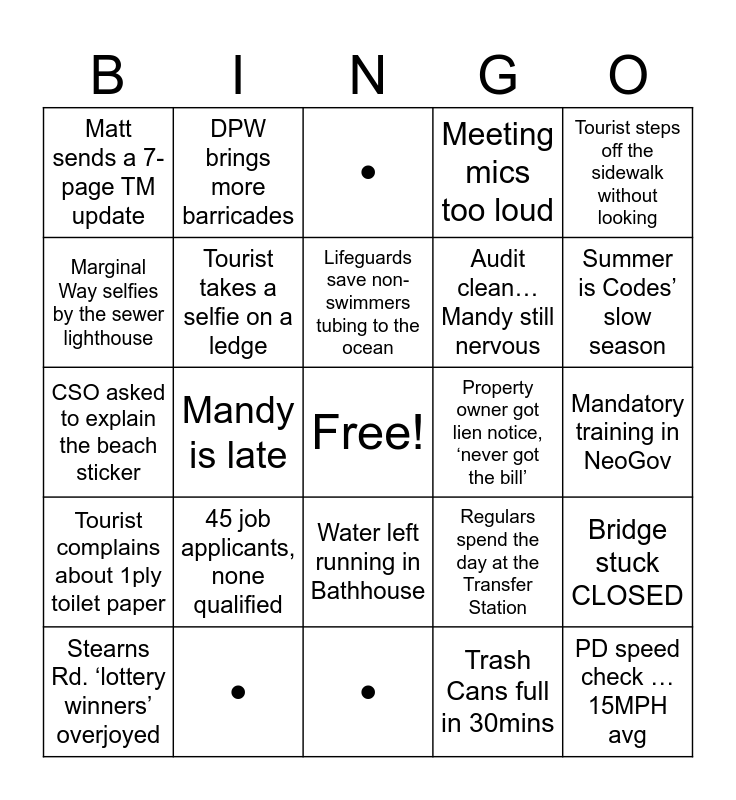 This bingo card has a free space and 67 words: Matt sends agenda 5 mins before the meeting, Chief Russ is out of Town, Bridge is stuck OPEN, Bridge stuck CLOSED, Land Use Budget fails, Meeting host says “You’re muted”, DPW brings more barricades, DPW buys more signs, Lifeguards save non-swimmers tubing to the ocean, Tourist calls about seaweed on the beach, Water left running in Bathhouse, Stearns Rd. hearing …again, Mandatory training in NeoGov, Tourist steps off the sidewalk without looking, Marriage license request 3:45pm Friday… wedding Sat, Marginal Way selfies by the sewer lighthouse, Mandy is late, Matt sends a 7-page TM update, Matt says I’ll keep this brief, Audit clean… Mandy still nervous, 45 job applicants, none qualified, Tourist complains about 1ply toilet paper, Meeting mics too loud, Trash Cans full in 30mins, Loves notes left in tax payments, Someone swears their shed isn’t a structure, Storm washes away Marginal Way railing, Dock argument standoff, Summer is Codes’ slow season, Someone says: It’s always been that way, PD speed check …15MPH avg, Sarah asks about lunch at 9am, Parking ticket contested, Town Clerk does a Dunks Run, Parking Question, Stearns Rd. ‘lottery winners’ overjoyed, Piping Plover spotted… cancel everything, Regulars spend the day at the Transfer Station, CSO asked to explain the beach sticker, Police called for trash can dumping, Tourist forgets their License plate, Tourist takes a selfie on a ledge, Property owner got lien notice, ‘never got the bill’, •, •, •, •, •, •, •, •, •, •, •, •, •, •, •, •, •, •, •, •, •, •, • and •.