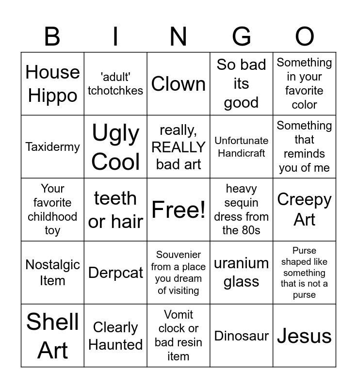 This bingo card has a free space and 24 words: Shell Art, Derpcat, really, REALLY bad art, Dinosaur, Something in your favorite color, House Hippo, 'adult' tchotchkes, Clown, heavy sequin dress from the 80s, Creepy Art, Your favorite childhood toy, Ugly Cool, uranium glass, Purse shaped like something that is not a purse, Taxidermy, Clearly Haunted, Vomit clock or bad resin item, So bad its good, Something that reminds you of me, Nostalgic Item, teeth or hair, Souvenier from a place you dream of visiting, Unfortunate Handicraft and Jesus.