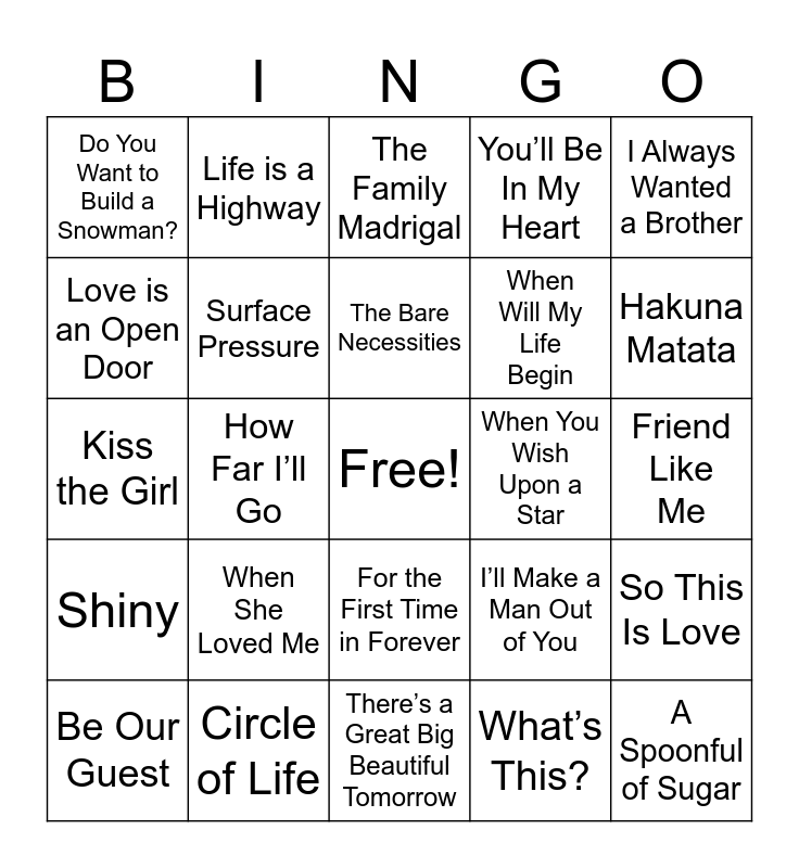 This bingo card has a free space and 42 words: Sorcerer’s Apprentice, The Bare Necessities, We’re All In This Together, When She Loved Me, What’s This?, So This Is Love, A Spoonful of Sugar, Beauty and the Beast, The Family Madrigal, For the First Time in Forever, Friend Like Me, Hakuna Matata, How Far I’ll Go, I Always Wanted a Brother, I Just Can’t Wait to Be King, I’ll Make a Man Out of You, Just Around the Riverbend, Kiss the Girl, Let It Go, Life is a Highway, Love is an Open Door, You’ve Got a Friend in Me, Colors of the Wind, Do You Want to Build a Snowman?, Under the Sea, We Don’t Talk About Bruno, When Will My Life Begin, Down in New Orleans, Never Smile at a Crocodile, Part of Your World, Remember Me, Shiny, Surface Pressure, There’s a Great Big Beautiful Tomorrow, Some Day My Prince Will Come, Be Our Guest, Circle of Life, When You Wish Upon a Star, Whistle While You Work, A Whole New World, You’ll Be In My Heart and You’re Welcome.