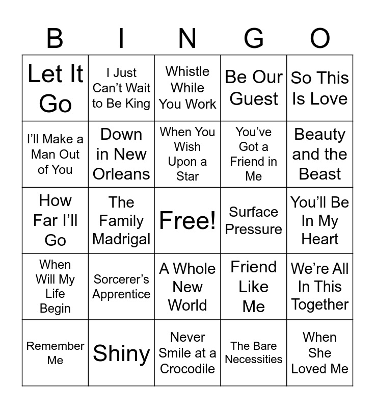 This bingo card has a free space and 42 words: Circle of Life, When You Wish Upon a Star, For the First Time in Forever, Sorcerer’s Apprentice, The Bare Necessities, We’re All In This Together, When She Loved Me, What’s This?, Whistle While You Work, A Whole New World, You’ll Be In My Heart, Beauty and the Beast, The Family Madrigal, So This Is Love, A Spoonful of Sugar, Friend Like Me, Hakuna Matata, How Far I’ll Go, I Always Wanted a Brother, I Just Can’t Wait to Be King, I’ll Make a Man Out of You, Just Around the Riverbend, Kiss the Girl, Let It Go, Life is a Highway, Love is an Open Door, You’ve Got a Friend in Me, Colors of the Wind, Do You Want to Build a Snowman?, Under the Sea, We Don’t Talk About Bruno, When Will My Life Begin, Down in New Orleans, Never Smile at a Crocodile, Part of Your World, Remember Me, Shiny, Surface Pressure, There’s a Great Big Beautiful Tomorrow, Some Day My Prince Will Come, Be Our Guest and You’re Welcome.