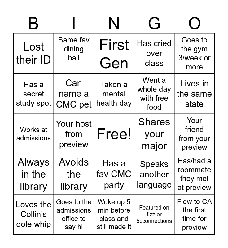 This bingo card has a free space and 24 words: Avoids the library, Goes to the admissions office to say hi, Taken a mental health day, Loves the Collin’s dole whip, Goes to the gym 3/week or more, Lost their ID, Has a secret study spot, Same fav dining hall, Shares your major, Has a fav CMC party, Went a whole day with free food, Works at admissions, Speaks another language, Has/had a roommate they met at preview, Can name a CMC pet, Featured on fizz or 5cconnections, Your friend from your preview, First Gen, Lives in the same state, Your host from preview, Flew to CA the first time for preview, Always in the library, Has cried over class and Woke up 5 min before class and still made it.