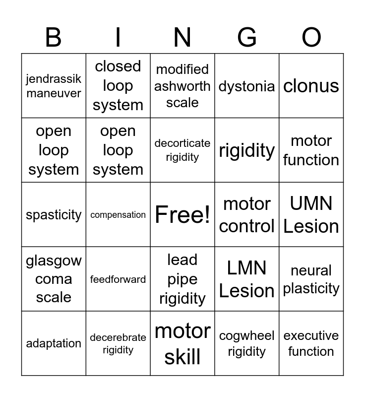 This bingo card has a free space and 26 words: lead pipe rigidity, cogwheel rigidity, decorticate rigidity, decerebrate rigidity, clonus, jendrassik maneuver, open loop system, closed loop system, UMN Lesion, LMN Lesion, rigidity, spasticity, neural plasticity, adaptation, compensation, substitution, dystonia, glasgow coma scale, modified ashworth scale, executive function, motor function, motor skill, motor control, feedforward, open loop system and closed loop system.
