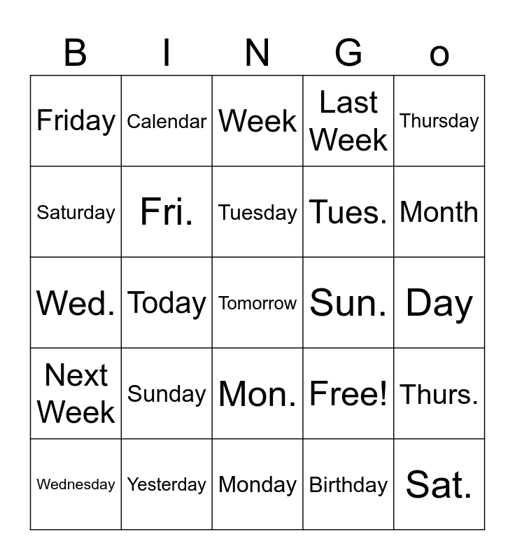 This bingo card has 25 words: Sunday, Monday, Tuesday, Wednesday, Thursday, Friday, Saturday, Calendar, Sun., Mon., Tues., Wed., Free!, Thurs., Fri., Sat., Day, Week, Month, Today, Tomorrow, Yesterday, Next Week, Last Week and Birthday.