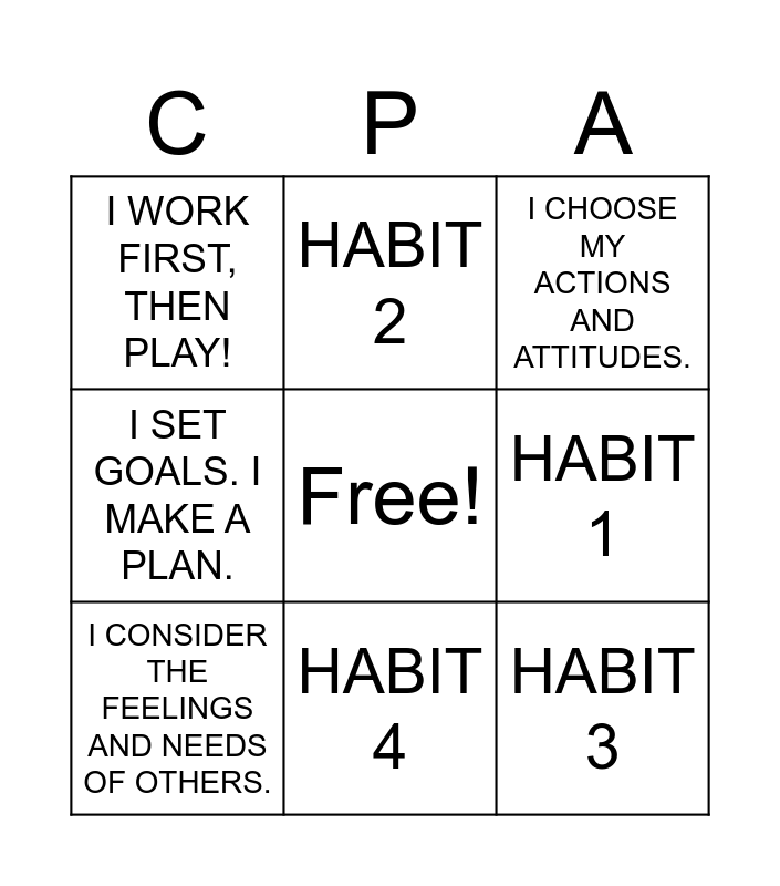This bingo card has a free space and 8 words: HABIT 1, I CHOOSE MY ACTIONS AND ATTITUDES., HABIT 2, I CONSIDER THE FEELINGS AND NEEDS OF OTHERS., I WORK FIRST, THEN PLAY!, HABIT 3, I SET GOALS. I MAKE A PLAN. and HABIT 4.