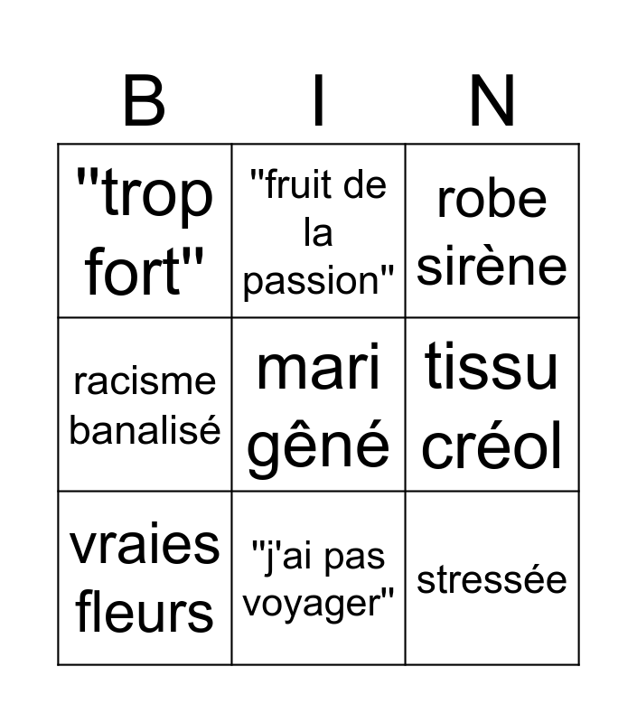 This bingo card has a free space and 8 words: tissu créol, robe sirène, ''fruit de la passion'', vraies fleurs, ''trop fort'', stressée, racisme banalisé and ''j'ai pas voyager''.