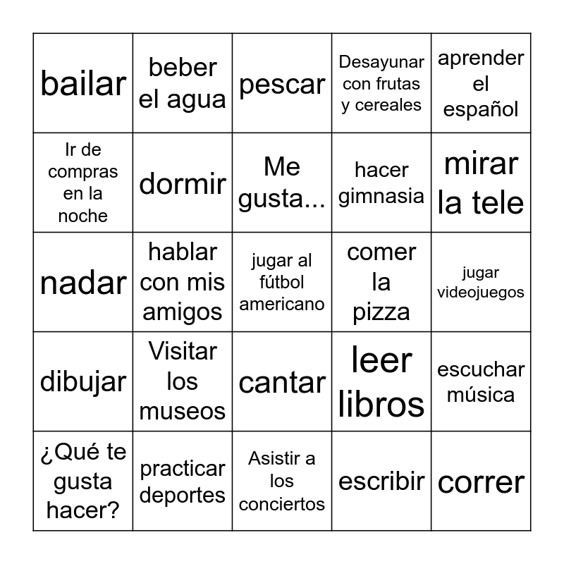 This bingo card has 30 words: ¿Qué te gusta hacer?, ¿Te gusta...?, Me gusta..., No me gusta..., aprender el español, bailar, beber el agua, cantar, comer la pizza, correr, dibujar, dormir, Free!, escribir, escuchar música, hacer la tarea, hablar con mis amigos, jugar al fútbol americano, leer libros, mirar la tele, nadar, practicar deportes, pescar, hacer gimnasia, jugar videojuegos, Ir de compras en la noche, Visitar los museos, Asistir a los conciertos, Desayunar con frutas y cereales and Cocinar los domingos.