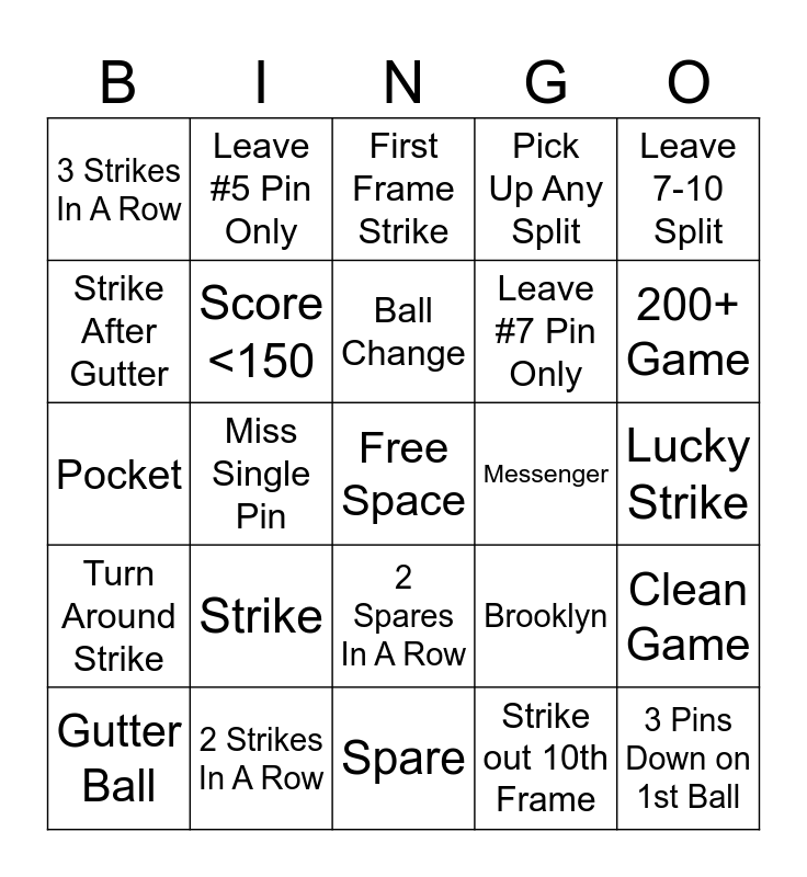 This bingo card has a free space and 24 words: Strike, 2 Strikes In A Row, Ball Change, Gutter Ball, Leave 7-10 Split, 3 Strikes In A Row, Strike After Gutter, Leave #5 Pin Only, Messenger, 2 Spares In A Row, Leave #7 Pin Only, Pocket, Brooklyn, Clean Game, Score <150, Strike out 10th Frame, Lucky Strike, First Frame Strike, 200+ Game, Miss Single Pin, 3 Pins Down on 1st Ball, Turn Around Strike, Pick Up Any Split and Spare.