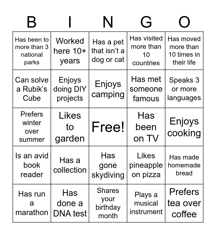 This bingo card has a free space and 24 words: Has a collection, Has done a DNA test, Enjoys camping, Has run a marathon, Has moved more than 10 times in their life, Has been to more than 3 national parks, Can solve a Rubik’s Cube, Worked here 10+ years, Has been on TV, Has gone skydiving, Has met someone famous, Prefers winter over summer, Likes pineapple on pizza, Has made homemade bread, Enjoys doing DIY projects, Plays a musical instrument, Enjoys cooking, Has a pet that isn’t a dog or cat, Speaks 3 or more languages, Likes to garden, Prefers tea over coffee, Is an avid book reader, Has visited more than 10 countries and Shares your birthday month.