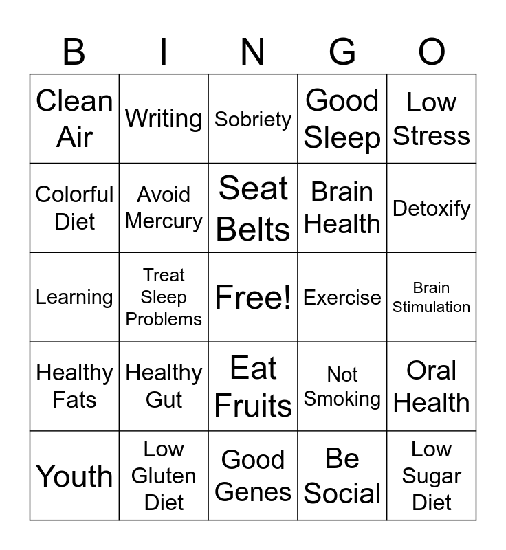 This bingo card has a free space and 24 words: Healthy Gut, Low Gluten Diet, Seat Belts, Youth, Low Stress, Clean Air, Colorful Diet, Writing, Exercise, Eat Fruits, Brain Health, Learning, Not Smoking, Oral Health, Avoid Mercury, Be Social, Brain Stimulation, Sobriety, Detoxify, Treat Sleep Problems, Low Sugar Diet, Healthy Fats, Good Sleep and Good Genes.