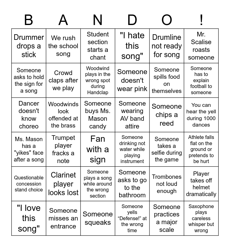 This bingo card has 65 words: Someone drops their instrument, Trombones not loud enough, Band gets off from the drums, Trumpet player fracks a note, Clarinet player looks lost, Someone misses the Eb at the beg. of Handclap, We rush the school song, Bass drum messes up during banner, Crowd claps after we play, Crowd doesn't clap after we play, You can hear the yell during 1000 dances, People leave to get food, Someone buys Ms. Mason candy, Drumline not ready for song, Someone leaves their instrument unattended, Mr. Scalise roasts someone, Someone has to explain football to someone, Drummer drops a stick, Free!, Woodwind plays in the wrong spot during Handclap, Someone chips a reed, Someone wearing AV band attire, "I hate this song", "I love this song", Student section does something questionable, Someone practices a major scale, Someone squeaks, Coach yells angrily, Dancer doesn't know choreo, Upset fan, Fan with a sign, Parent is a little too into the game..., Someone sings/hums one of the songs we play, Someone doesn't shout the shouting parts, Ms. Mason has a "yikes" face after a song, Someone drinking not water while playing instrument, We clap for ourselves, Someone spills food on themselves, Athlete falls flat on the ground or pretends to be hurt, Saxophone plays careless whisper but wrong, Someone asks to hold the sign for a song, Someone plays a song while around the wrong section, Woodwinds look offended at the brass, We play a song a little too fast for comfort, Song is awkwardly under tempo, Someone misses an entrance, Someone doesn't wear pink, Someone played on a rest and everyone knew, Questionable concession stand choice, Someone asks to go to the bathroom, Someone forgot something in the band room, Someone waves at their parents in the stands, Someone forgets their lyre, Someone takes a selfie during the game, "What song are we playing?", Someone dances during a stand tune, A percussionist air drums, Student section starts a chant, Player takes off helmet dramatically, Someone yells “Defense!” at the wrong time, Baby in the stands with giant headphones, Someone spills popcorn, Crowd member dances to band music, A random dog shows up at the game and Someone says “when’s halftime?” before halftime.