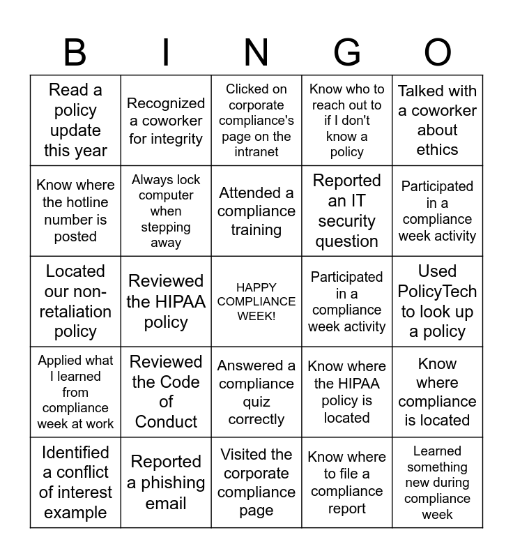 This bingo card has a free space and 24 words: Reviewed the Code of Conduct, Reported a phishing email, Attended a compliance training, Identified a conflict of interest example, Talked with a coworker about ethics, Read a policy update this year, Know where the hotline number is posted, Recognized a coworker for integrity, Participated in a compliance week activity, Answered a compliance quiz correctly, Reported an IT security question, Located our non-retaliation policy, Know where the HIPAA policy is located, Know where compliance is located, Always lock computer when stepping away, Know where to file a compliance report, Used PolicyTech to look up a policy, Clicked on corporate compliance's page on the intranet, Participated in a compliance week activity, Reviewed the HIPAA policy, Learned something new during compliance week, Applied what I learned from compliance week at work, Know who to reach out to if I don't know a policy and Visited the corporate compliance page.