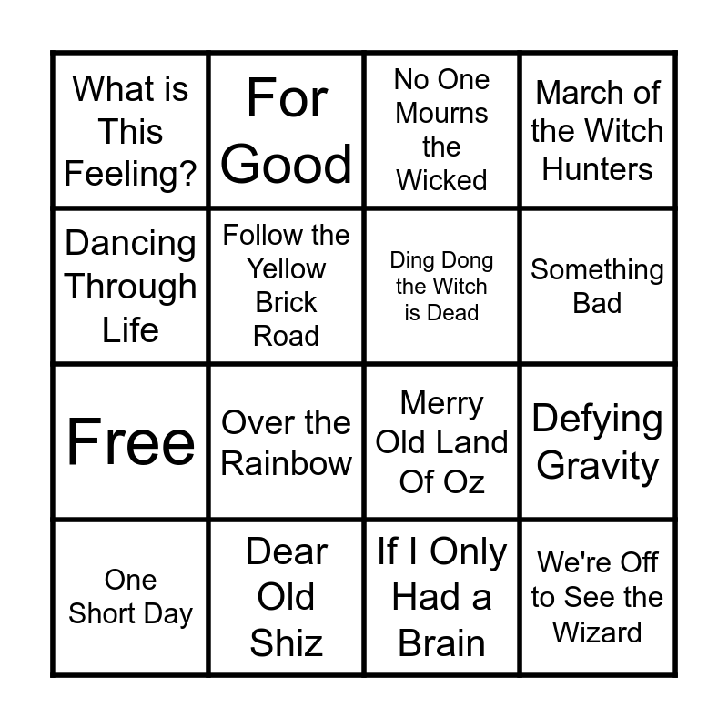This bingo card has 20 words: Defying Gravity, Popular, No One Mourns the Wicked, The Wizard and I, One Short Day, Dancing Through Life, Dear Old Shiz, What is This Feeling?, Free, For Good, Over the Rainbow, Merry Old Land Of Oz, Follow the Yellow Brick Road, We're Off to See the Wizard, Ding Dong the Witch is Dead, If I Only Had a Heart, Something Bad, March of the Witch Hunters, If I Only Had a Brain and Munchkin Welcome.