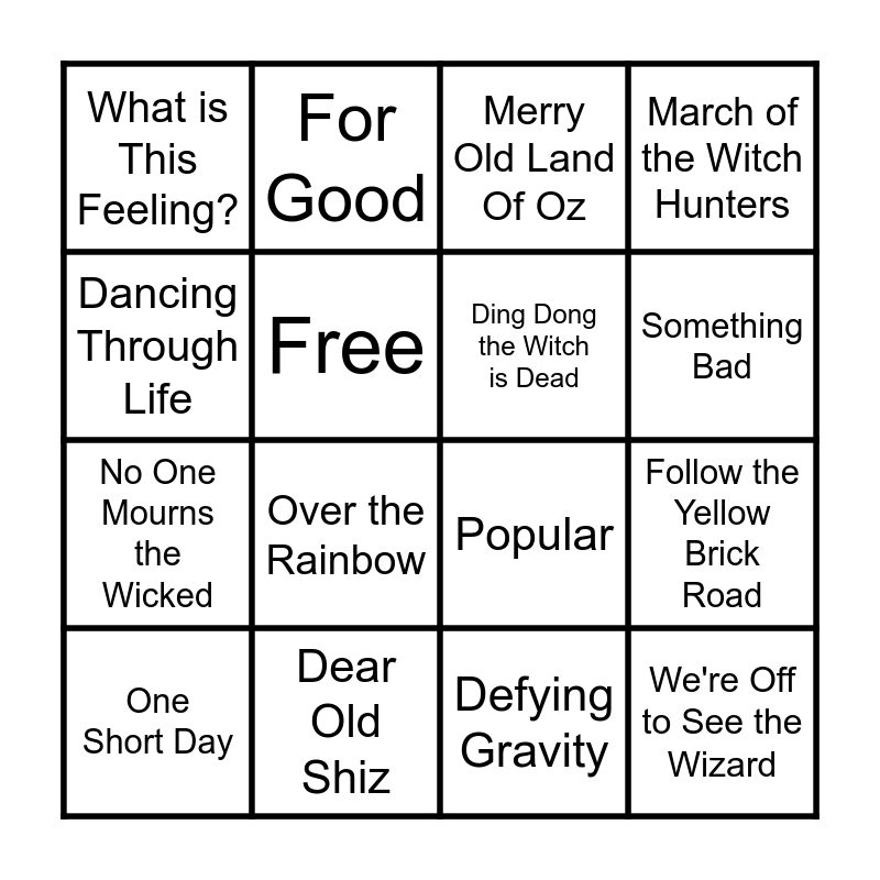 This bingo card has 20 words: Follow the Yellow Brick Road, If I Only Had a Brain, Merry Old Land Of Oz, The Wizard and I, One Short Day, Dancing Through Life, Dear Old Shiz, What is This Feeling?, No One Mourns the Wicked, For Good, Over the Rainbow, Popular, Free, We're Off to See the Wizard, Ding Dong the Witch is Dead, If I Only Had a Heart, Something Bad, March of the Witch Hunters, Defying Gravity and Munchkin Welcome.