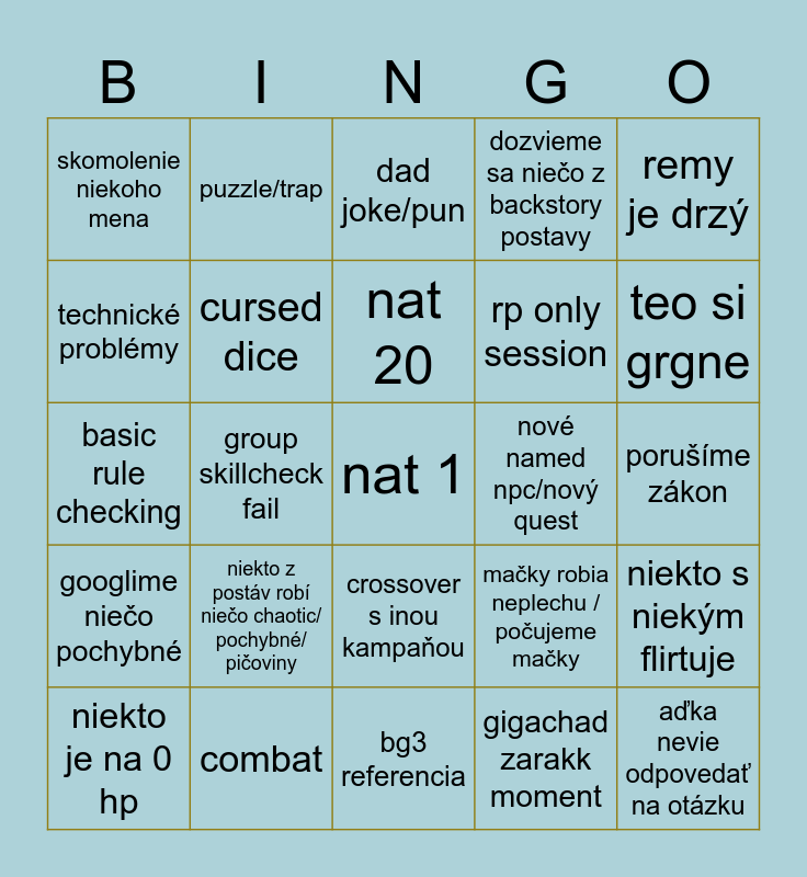 This bingo card has 25 words: niekto z postáv robí niečo chaotic/ pochybné/ pičoviny, bg3 referencia, nat 20, niekto je na 0 hp, remy je drzý, skomolenie niekoho mena, technické problémy, puzzle/trap, nové named npc/nový quest, crossover s inou kampaňou, rp only session, basic rule checking, mačky robia neplechu / počujeme mačky, niekto s niekým flirtuje, cursed dice, aďka nevie odpovedať na otázku, porušíme zákon, dad joke/pun, teo si grgne, group skillcheck fail, nat 1, combat, googlime niečo pochybné, dozvieme sa niečo z backstory postavy and gigachad zarakk moment.