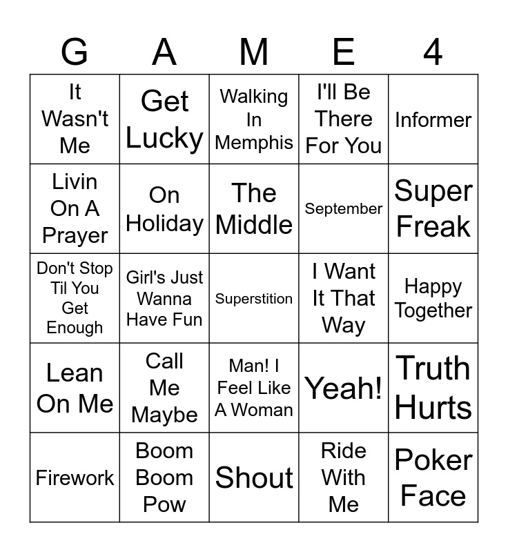 This bingo card has a free space and 47 words: I Wanna Dance With Somebody, Poker Face, Jessie's Girl, Shout, Call Me Maybe, Love Song, Get Lucky, Uptown Funk, Livin On A Prayer, Glamorous, On Holiday, I'll Be There For You, Truth Hurts, Yeah!, Call Me, With Or Without You, The Middle, I Want It That Way, My Prerogative, Informer, Girl's Just Wanna Have Fun, Ride With Me, It Wasn't Me, September, Tainted Love, Super Freak, Firework, Love Shack, Man! I Feel Like A Woman, Lean On Me, Irreplaceable, Rock With You, Total Eclipse Of The Heart, Radioactive, Take A Chance On Me, Boom Boom Pow, Happy Together, Stronger, Bad Romance, Shape Of You, The Way You Make Me Feel, Walking In Memphis, Don't Stop Til You Get Enough, Africa, All Star, Stayin Alive and Don't Go Breaking My Heart.