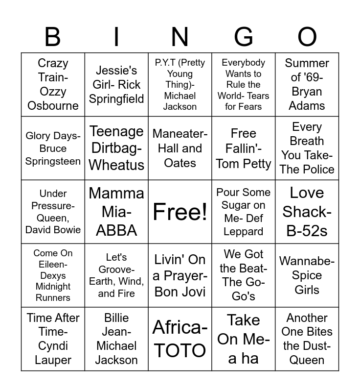 This bingo card has a free space and 24 words: Let's Groove- Earth, Wind, and Fire, Billie Jean- Michael Jackson, Maneater- Hall and Oates, Time After Time- Cyndi Lauper, Summer of '69- Bryan Adams, Crazy Train- Ozzy Osbourne, Glory Days- Bruce Springsteen, Jessie's Girl- Rick Springfield, Pour Some Sugar on Me- Def Leppard, Livin' On a Prayer- Bon Jovi, Free Fallin'- Tom Petty, Under Pressure- Queen, David Bowie, We Got the Beat- The Go- Go's, Wannabe- Spice Girls, Teenage Dirtbag- Wheatus, Take On Me- a ha, Love Shack- B-52s, P.Y.T (Pretty Young Thing)- Michael Jackson, Every Breath You Take- The Police, Mamma Mia- ABBA, Another One Bites the Dust- Queen, Come On Eileen- Dexys Midnight Runners, Everybody Wants to Rule the World- Tears for Fears and Africa- TOTO.